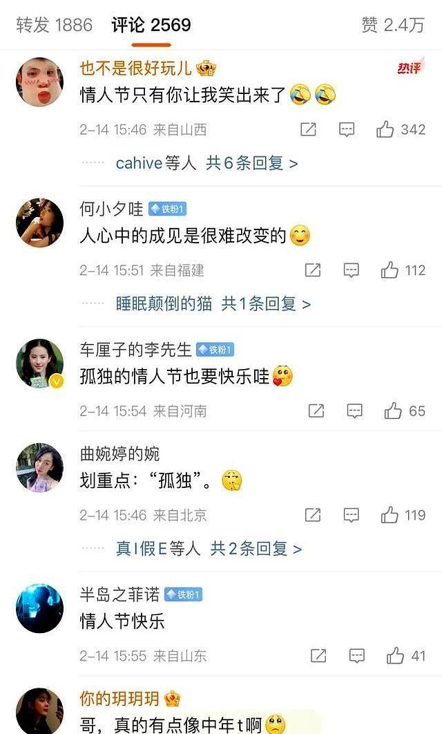 这已经不是头一回了。去年离婚节目播完那阵子,杨子就在微博上发过类似的感慨。那时候评论区还有人劝他想开点,现在倒好,全是看热闹不嫌事大的。有人翻出他去年情人节晒的玫瑰花照片,跟今年这个黑漆漆的图放一块儿对比。那束玫瑰当时还上了热搜,说是九百九十九朵进口红玫瑰,现在看真是讽刺。有网友说"这人设崩得比股票跌得还快",第二个网友说"装深沉也不看看场合,情人节谁听你诉苦"。说真的,正常人过节都忙着约会吃饭,谁有功夫在网上发这种酸溜溜的话?